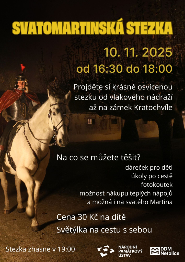 Osvícená cyklostezka od vlakového nádraží v Netolicích až na zámek Kratochvíle. Na začátku děti dostanou pokyny a malou odměnu za cestu, kterou zvládnou dojít až za sv. Martinem. Po cestě je možné zakopit teplé nápoje a plnit připravené úkoly. Pokud chcete zažít celou osvícenou stezku, ale máte menší děti, které by nezvládly cestu tam i zpátky, doporučujeme vysadit děti s jedním dospělým u vlakového nádraží, zaparkovat na parkovišti u zámku Kratochvíle a přijít jim naproti.